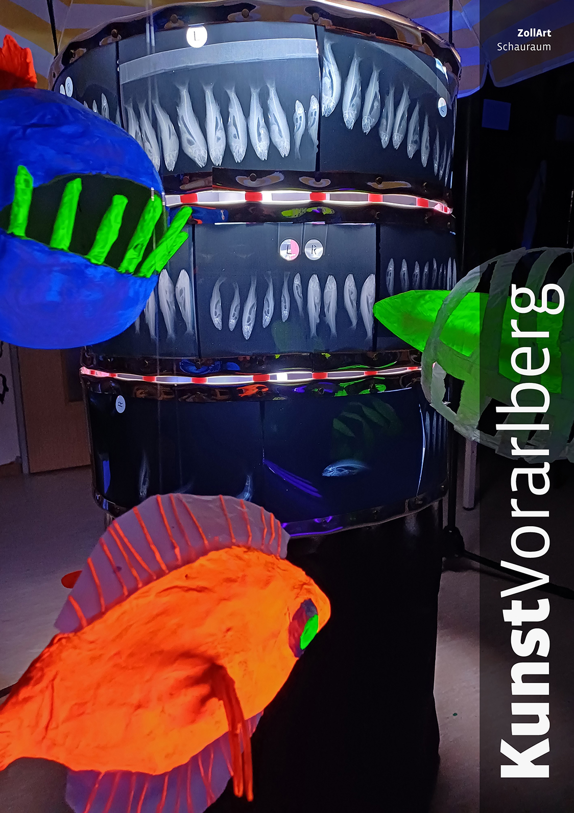 Um darauf zu sensibilisieren, gestalten Erika Lutz und May-Britt Nyberg den ZollArt-Schauraum zu einer Art kleiner Tiefsee-Zone. Im abgedunkelten Raum „schwimmen“ bunte, leuchtende Fische aus Papiermache von Nyberg, die teils schräg, teils aber auch bedrohlich wie kleine Tiefseemonster daherkommen. In der Nacht wird die Leuchtkraft der Acrylfarben durch Schwarzlicht verstärkt. Lutz hat Röntgenbilder von Fischen zu einer kaleidoskopartigen Installation zusammengestellt. Angestrahlt von Spots erscheinen diese Radiografien, die auf das Innere der Fische verweisen, wie filigrane Ornamente.